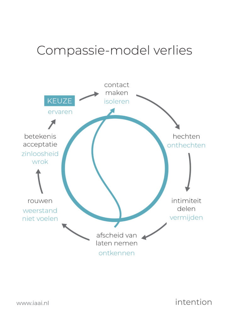 Twee flyers voor een Transactionele Analyse workshop en de Coaching Essentials training. De eerste pagina van een pdf over de coachingsmethode: ‘opstelling met poppetjes’ en een poster met een versie van het Compassie-model in de Intention huisstijl.